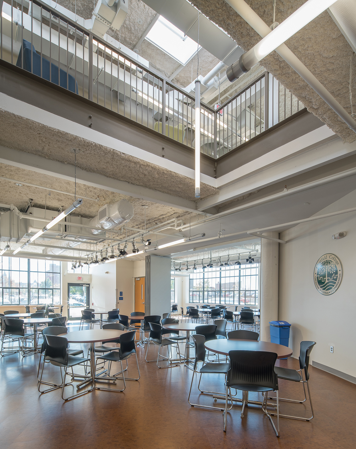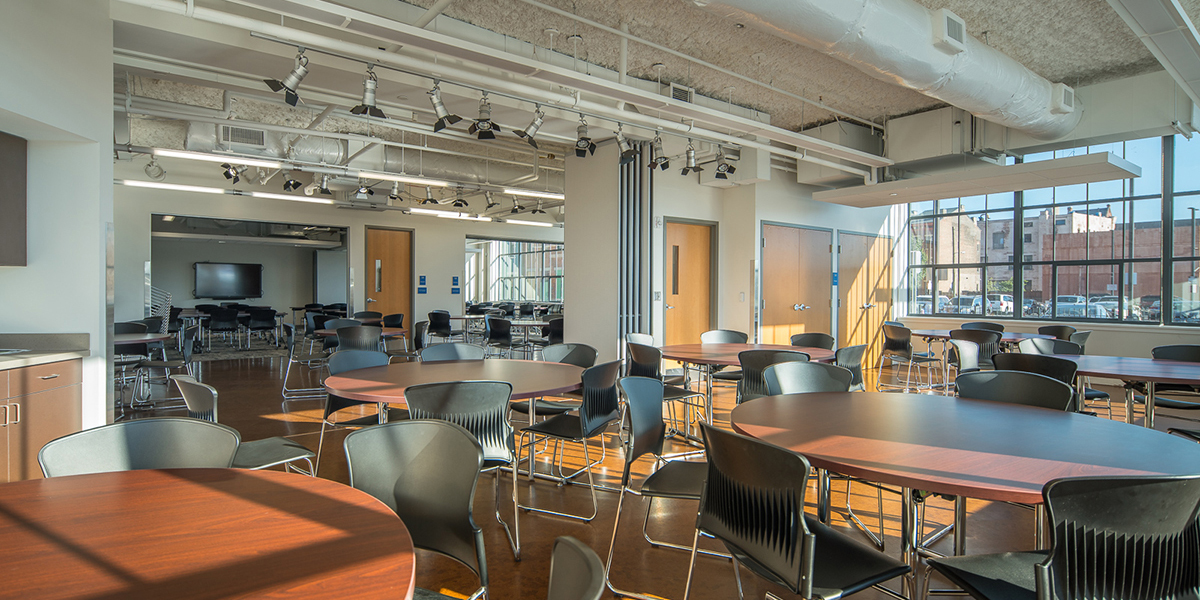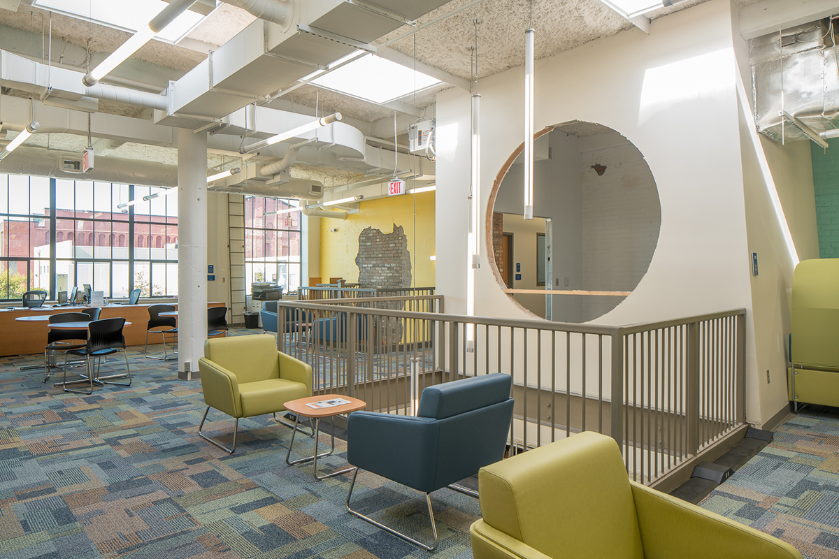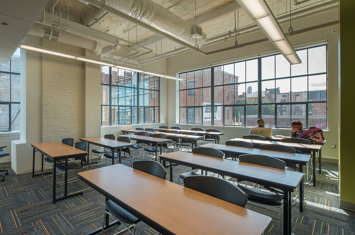 An extensive building assessment and audit, a LEED analysis, and a master plan were conducted for an1890’s historic building in order to validate it’s purchase by Chatfield College, a former liberal arts college in downtown Cincinnati. The final renovation design focused on flexibility, shared spaces, and efficient circulation in order to accommodate the academic program and to maximize the client’s budget. Energy models were performed to ensure high efficiency by properly locating spaces within the building. Classrooms and laboratories lined the perimeter and featured acoustic moveable walls and glazed garage doors that enlarged or reduced the space based on the needs of the academic term. Skylights provided an abundance of daylight to the central study lounge on the second floor, while an opening in the lounge’s floor provided a physical and visual connection, in addition to natural daylight to the 1st floor cafe. The building houses classrooms, student casual spaces, faculty and administrative offices, an art studio, laboratory and a chapel.