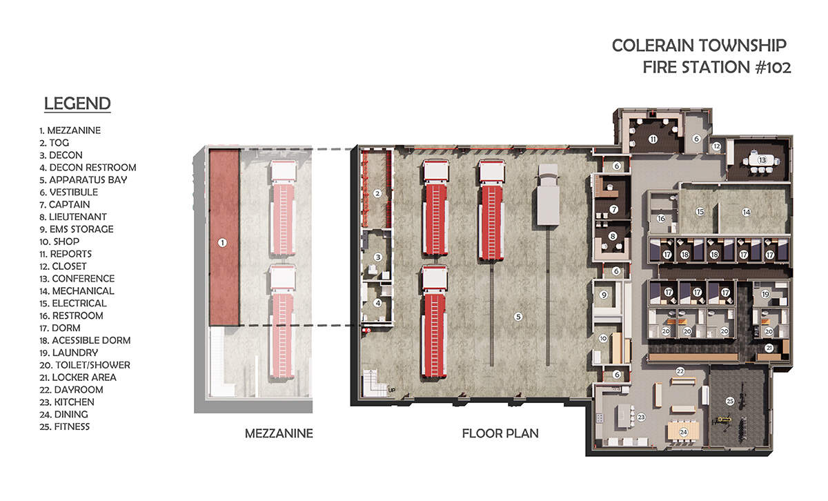 New stations 26 and 102 are the result of a comprehensive master plan completed by emersion DESIGN. The department is staffed 24-7-365 and has three, 24-hour shifts. Station 102 focuses on physical wellness with oversized double-doors in the fitness room that open to the outside, bringing in fresh air and sunlight. This simple design feature was a priority and increases overall staff well-being through a connection to nature. Like Station 26, Station 102 also incorporates geothermal energy with a planned Site Energy Use Intensity (EUI) of 35 and a stretch goal of 25 or less, which is eco-friendly and saves money in utility bills. There is a special emphasis on firefighter mental health in both projects. The design increases access to daylight and the natural environment surrounding the site. Simple adjustments in the design process, such as window placements make a significant impact.