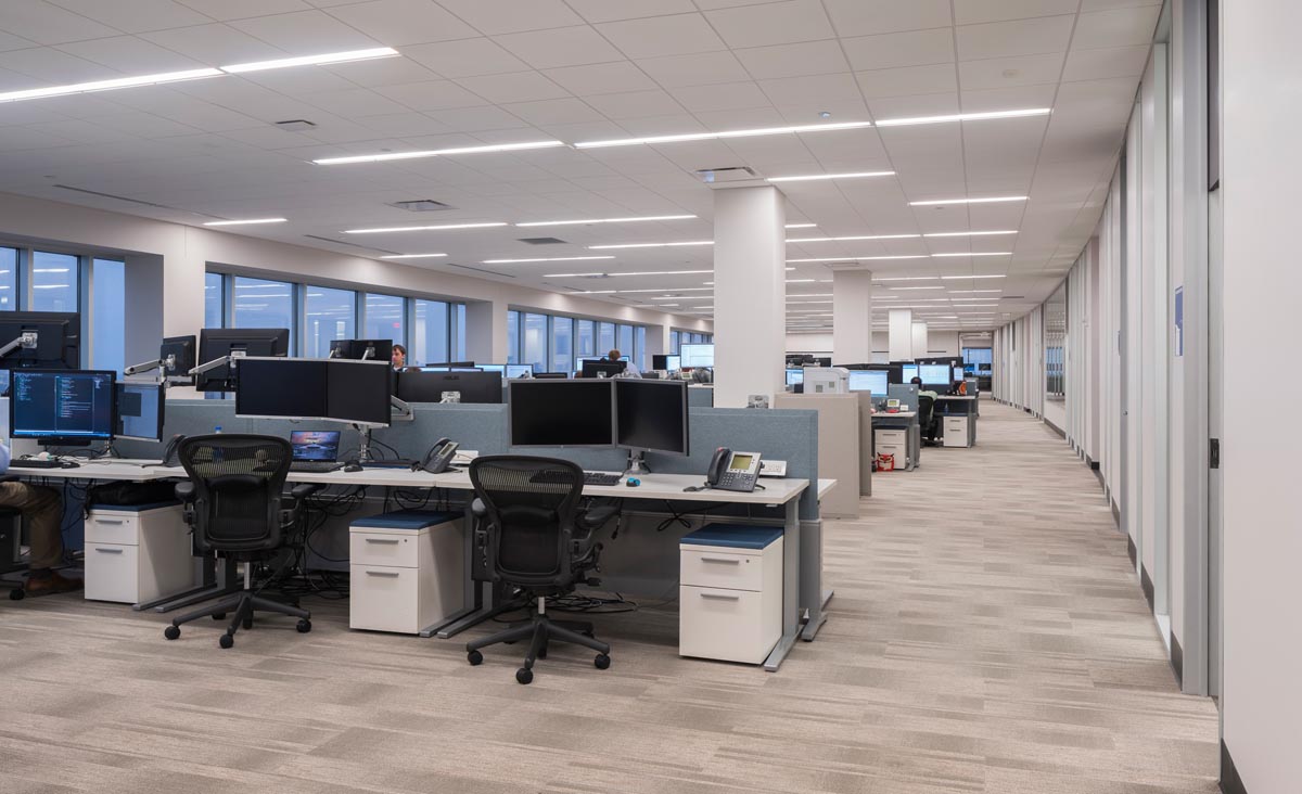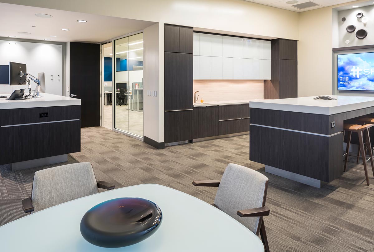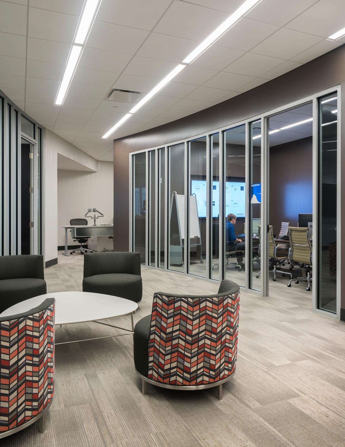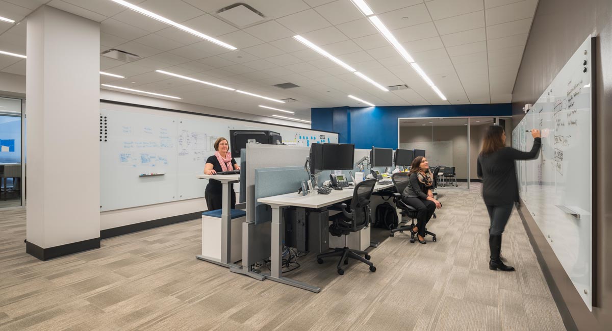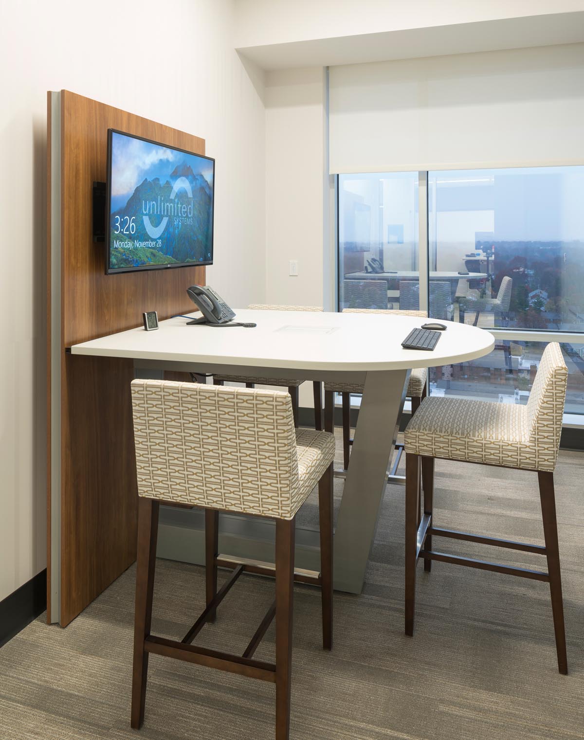 Unlimited Systems is a software and program development company specializing in medical information technology. Phase I included a 25,000 sf temporary corporate location to facilitate a phased move. The temporary location provided an opportunity to utilize existing furniture systems in different configurations; experimenting with individual work area sizes, layouts, private work zones, shared or teaming work zones, enclosed conference rooms, and open access huddle e space. An in depth programming exercise with participation across the company’s departmental structure revealed an opportunity to test various departmental adjacencies for improved communication and customer service. Unlimited Systems’ permanent corporate home office occupied 32,000 sf in a highly visible location. Program data combined with methods tested in the temporary location resulted in an efficient and productive corporate office space. Technology programming was critical and provided infrastructure for current and future spaces that included flexible, changeable, and cost effective furniture systems.