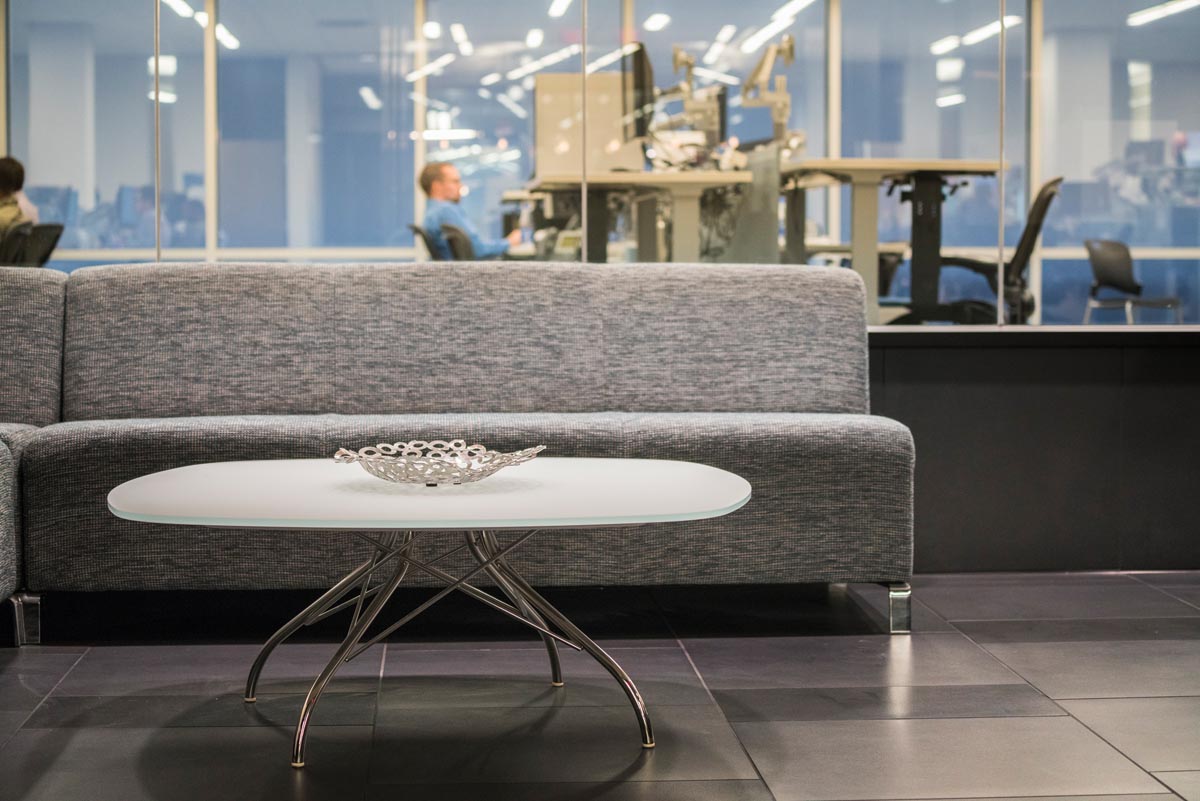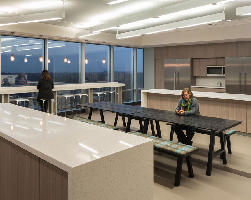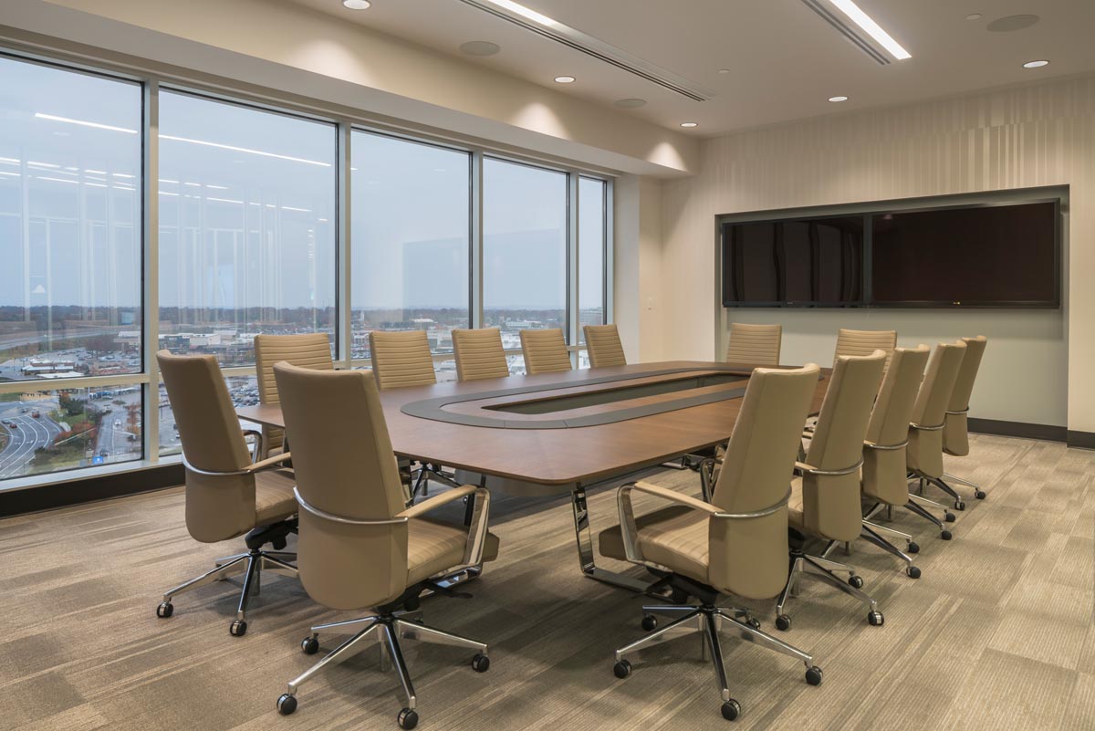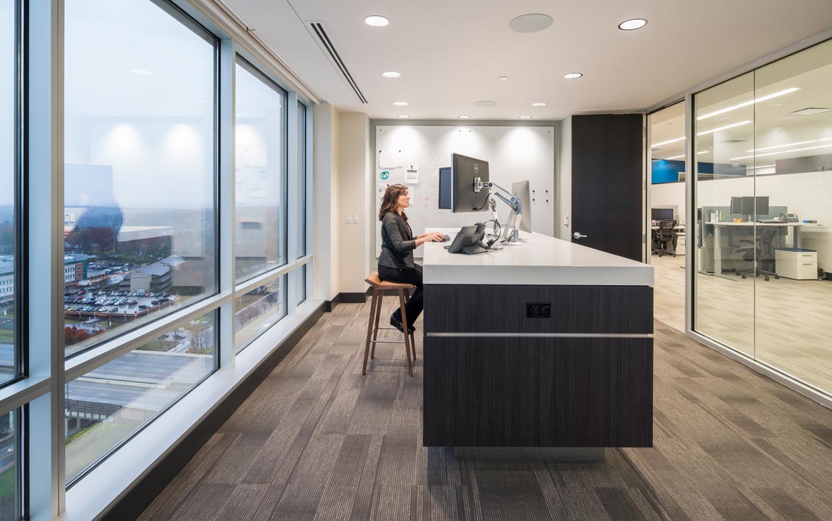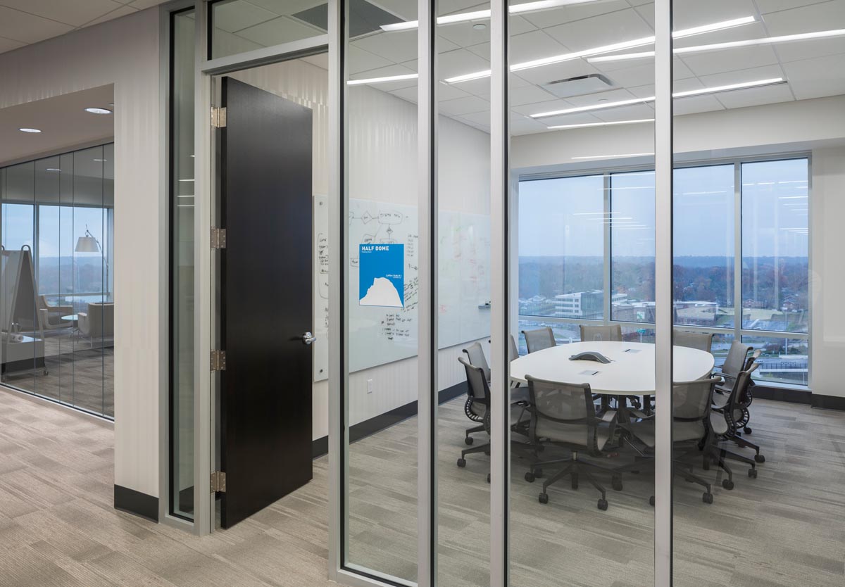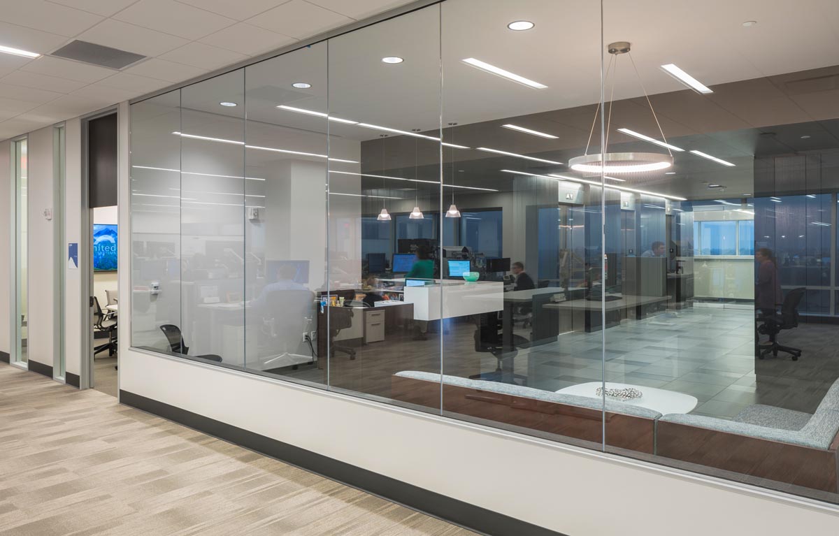 Unlimited Systems is a software and program development company specializing in medical information technology. Phase I included a 25,000 sf temporary corporate location to facilitate a phased move. The temporary location provided an opportunity to utilize existing furniture systems in different configurations; experimenting with individual work area sizes, layouts, private work zones, shared or teaming work zones, enclosed conference rooms, and open access huddle e space. An in depth programming exercise with participation across the company’s departmental structure revealed an opportunity to test various departmental adjacencies for improved communication and customer service. Unlimited Systems’ permanent corporate home office occupied 32,000 sf in a highly visible location. Program data combined with methods tested in the temporary location resulted in an efficient and productive corporate office space. Technology programming was critical and provided infrastructure for current and future spaces that included flexible, changeable, and cost effective furniture systems.